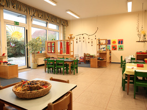 Die Kinder unter drei Jahren finden altersentsprechende, natürliche Materialien in ihrem Gruppenraum vor. Unterschiedliche Ebenen, Wand- und Bodenbelege fördern Sinneswahrnehmungen, die Funktionalität und die Bewegung. Decken, Kissen und Körbe ermöglichen eigenständig geschaffene Kuschel- oder Rückzugsmöglichkeiten.
